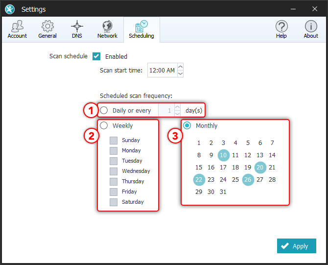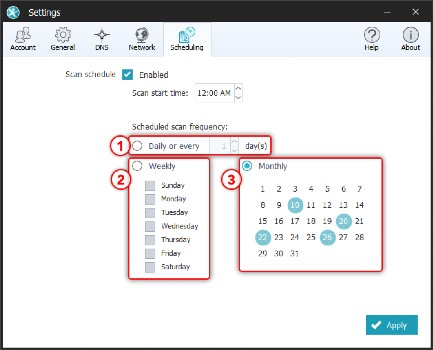 Remarque: Cliquez sur le bouton « Appliquer » en bas à droite de l'onglet « Planification » pour mettre au point les modifications que vous avez apportées à la planification de scan, y compris l'activation ou la désactivation de la fonctionnalité.